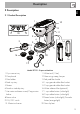 Use 3 Use 3.1 Before first use 1. Remove any labels and stickers from the espresso machine. 2. Thoroughly wash and dry the espresso machine’s parts (see “4 Cleaning and maintenance”). 3. Remove the cover (1) by pulling it upwards and then pull out the tank (2). 4. Fill the tank (2) with fresh, clean water directly from the faucet or by using a pitcher, being careful not to exceed the maximum level indicated on the tank.