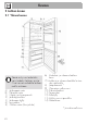 Sisällysluettelo 1.1 1.2 1.3 1.4 1.5 1.6 1.7 1.8 1.9 Turvallisuuteen liittyvät yleiset varoitukset Valmistajan vastuu Laitteen käyttötarkoitus Hävittäminen Huoltopalvelu Tyyppikilpi Energiamerkintä Tämä käyttöohje Miten käyttöohjetta luetaan 2 Laitteen kuvaus 2.1 Yleinen kuvaus 3 Laitteen käyttö 3.1 3.2 3.3 3.4 3.5 Tietoja uuden sukupolven jäähdytystekniikasta Näyttö ja ohjauspaneeli Jääkaapin toiminta pakastimella Lämpötilan säätöön liittyvät varoitukset Lisävarusteet 4 Elintarvikkeiden säilytys 4.
