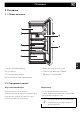 Описание 2 Описание RU 2.1 Общее описание 1 Морозильная камера 2 Вентилятор 3 Холодильная камера 4 Слив воды от размораживания. 5 Ящик для зелени и овощей 6 Панель управления/Лампа 7 Дверца холодильника 2.2 Определение частей Морозильная камера Вентилятор Используется для хранения замороженных продуктов питания, для заморозки свежих продуктов и для производства кубиков льда. Необходим для распределения температуры и уменьшения конденсата на опорных поверхностях.