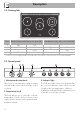 Description 2.2 Cooking hob Zone 1 2 3 4 Outside diameter (mm) Max. power draw (W)* Inside diameter (mm) Max. power draw (W)* 150 210 oval plate 195 1200 2000 2200 2000 120 170 - 750 1400 - * Power levels are approximate and can vary according to the pan used or the settings made. 2.3 Control panel 1 Minute minder timer knob 3 Indicator light Allows you to set manual cooking or a timer with automatic oven switch off at the end of cooking.