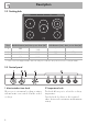 Description 2.2 Cooking hob Zone 1 2 3 4 Outside diameter (mm) Max. power draw (W)* Inside diameter (mm) Max. power draw (W)* 150 210 oval plate 195 1200 2000 2200 2000 120 170 - 750 1400 - * Power levels are approximate and can vary according to the pan used or the settings made. 2.3 Control panel 1 Minute minder timer knob 2 Temperature knob Allows you to set manual cooking or a timer with automatic oven switch off at the end of cooking. This knob allows you to select the cooking temperature.