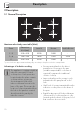 Description EN 2.2 Control panel 1 On/Off button 2 Pause button. 3 Cooking zone and timer setting area This area has 5 radial LEDs that branch out from the button to the buttons, which light up to indicate that the corresponding cooking zone has been activated. 4 Cooking zone display 5 Timer display Power control The hob is fitted with a power control module that optimises/limits consumption.