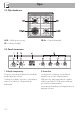 Opis 2.2 Płyta kuchenna AUX = Palnik pomocniczy SR = Palnik półszybki UR-3c = Palnik ultraszybki 2.3 Panel sterowania 1 Pokrętło temperatury 2 Kontrolka Za pomocą tego pokrętła można wybrać temperaturę pieczenia. Przekręcić pokrętło w prawo, na żądaną wartość w zakresie od minimum do maksimum. Jej włączenie wskazuje, że piekarnik znajduje się w fazie nagrzewania. Wyłącza się, gdy temperatura osiągnie ustawioną wartość.