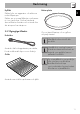 Baker-platta Koksticka Baker-plattan ska, för en optimal funktion, placeras mitt på gallret. När man använder mikrovågor för att värma upp vätska kan kokprocessen bli fördröjd. För att undvika detta fenomen ska man placera medföljande koksticka (eller en värmebeständig plastsked) i kärlet inför uppvärmning. Hög temperatur Fara för brännskada • Tillbehöret kan bli mycket varmt. Använd alltid grillvantar vid hantering.