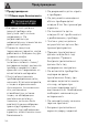 • Запрещается прикладывать чрезмерное усилие на открытую дверцу. • Не поднимайте и не перемещайте пробор за рукоятку дверки. Установка и техобслуживание • ЗАПРЕЩАЕТСЯ УСТАНАВЛИВАТЬ ЭТОТ ПРИБОР НА КАТЕРАХ ИЛИ В ТРЕЙЛЕРАХ. • Прибор нельзя устанавливать на подставку. • Встраивание прибора в мебель следует производить вдвоем. • Для предотвращения перегрева прибора не рекомендуется устанавливать его за декоративными дверями или панелями.