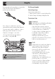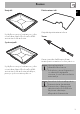 3.3 Lisävarusteiden käyttö Uunipellin ritilä Ritilät ja uunipellit Uunipellille tarkoitettu ritilä tulee asettaa pellin sisälle. Tällä tavoin voit kerätä rasvan erillään paistettavasta ruoasta. Ritilät ja uunipellit tulee asettaa sivutasotukien päälle niiden pysähtymiskohtaan asti. • Mekaanisten turvalukitusten, jotka estävät ritilän tahatonta ulosvetoa, tulee olla alasuuntaan ja uunin takaosaan päin. Varras Paistinvartaalla paistettaessa aseta paistinvartaan tuki kolmannelle tasolle.
