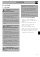 Installation 5.3 Placering Placering av försörjningskabeln Tung apparat Fara för klämskador • Ta hjälp av en andra person vid installation av apparaten. Tryck på öppen lucka Risk för skador på apparaten Värmeutveckling vid drift av apparaten Brandrisk • Kontrollera att möbelns material är värmebeständigt. • Kontrollera att det finns korrekta öppningar i möbeln. • Installera aldrig apparaten i ett luckförsett utrymme eller i en byrå.
