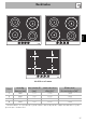 NO Beskrivelse Modeller med ramme Sone 1 2 3 4 Utvendig Min. kokekar Ø diameter (mm) (mm) 180 110 230 120 180 110 230 120 Maks. absorbert effekt (W)* 1300 2300 1300 2300 Effektforbruk i Booster-funksjon (W)* 1400 3000 1400 3000 * effektverdiene er veiledende og kan variere avhengig av de valgte innstillingene og av spenningen i strømnettet.