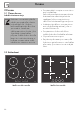 Kuvaus 2.3 Symbolit Kytkimet OFF-asento Keittoalue on sammunut. Booster-asento Tässä asennossa aktivoituu keittoalueen booster-toiminto. Tehokuumennus Tässä asennossa aktivoituu keittoalueen tehokuumennus. Keittoalueet Käännä kytkintä myötä- tai vastapäivään tai vähennä keittoalueen tehoa jonka arvo näkyy näytöllä.