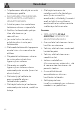 Varoitukset • Älä koskaan yritä korjata laitetta yksin tai ilman pätevän teknikon apua. • Jos virtajohto on vahingoittunut, ota välittömästi yhteyttä tekniseen huoltoon, joka vaihtaa sen uuteen. Laitteelle aiheutuvat vahingot • Älä käytä hankaavia tai syövyttäviä puhdistusaineita luukun lasiosien puhdistamiseen (esim. jauhetuotteita, tahranpoistoaineita ja metallisia sieniä). • Käytä mahdollisesti puisia tai muovisia keittiövälineitä. • Älä istu laitteen päälle. • Älä käytä tukialustana.