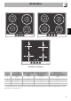 NO Beskrivelse Modeller med ramme Sone 1 2 3 4 Utvendig Min. kokekar Ø diameter (mm) (mm) 160 110 210 120 160 110 210 120 Maks. absorbert effekt (W)* 1300 2300 1300 2300 Effektforbruk i Booster-funksjon (W)* 1400 3000 1400 3000 * effektverdiene er veiledende og kan variere avhengig av de valgte innstillingene og av spenningen i strømnettet.