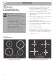 Bruk Advarsler Høy temperatur Fare for forbrenninger • Beskytt hendene med grytevotter under bruk. • Ikke berør eller rengjør platetoppens overflate mens den er i bruk, eller når kontrollampene for restvarme lyser. • Ikke plasser tomme kasseroller eller panner på kokesoner som er slått på. • Ikke la barn som er yngre enn 8 år oppholde seg i nærheten av produktet under bruk. • Aktiver tastelåsen, hvis barn eller husdyr som kan nå platetoppen er i nærheten. • Etter bruk må kokesonene slås av.