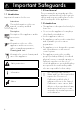 Important Safeguards 1 Instructions 1.1 Introduction Important information for the user: Instructions General information on this user manual, on safety and final disposal. Description Description of the appliance and its accessories. Use Information on the use of the appliance and its accessories, advice regarding preparations. Cleaning and care Information for correct cleaning and care of the appliance. Safety instructions Information Advice 8 1.