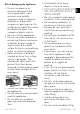 Risk of damaging the appliance • Do not use abrasive or corrosive detergents (e.g. scouring powders, stain removers and metallic sponges), rough or abrasive materials or sharp metal scrapers on glass parts as this could cause scratch the surface and break the glass. Use wooden or plastic utensils. • Do not sit on the appliance. • Do not use cleaning products containing chlorine, ammonia or bleach on parts made of steel or that have metallic surface finishes (e.g. anodizing, nickel- or chromium-plating).