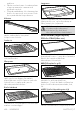 metallsvamper), grove materialer eller skarpe metallskraper, som vil kunne lage riper i overflaten eller skade glasset. Bruk eventuelt redskaper i tre eller plast. • Ikke sitt på produktet. • Ikke bruk rengjøringsprodukter som inneholder klor, ammoniakk eller blekemiddel på ståldeler, eller deler med metallisk overflatefinish (f.eks. anodisering, fornikling eller kromatering). • Rister og bakebrett må settes inn i sidesporene og skyves inn så langt det går.