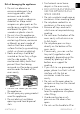 Risk of damaging the appliance • Do not use abrasive or corrosive detergents (e.g. scouring powders, stain removers and metallic sponges), rough or abrasive materials or sharp metal scrapers on glass parts as this could cause scratch the surface and break the glass. Use wooden or plastic utensils. • Do not sit on the appliance. • Do not use cleaning products containing chlorine, ammonia or bleach on parts made of steel or that have metallic surface finishes (e.g. anodizing, nickel- or chromium-plating).