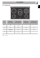 Description EN 2.2 Cooking hob Zone Diameter outside (mm) Max. power absorbed (W)* Diameter inside (mm) Max. power absorbed (W)* 1 147 1200 - - 2 212 2000 122 750 3 oval plate 2200 170 1400 4 182 2000 - - * power levels are approximate and may vary according to the settings made and the mains voltage.