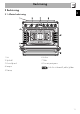Beskrivning 2.4 Andra delar Kylfläkt Positioneringsnivåer Fläkten har som funktion att kyla ner ugnen och aktiveras vid tillagning. Fläktens funktion leder till ett normalt luftflöde som kommer ut från apparatens baksida vilket kan fortsätta under en kortare tid även efter att apparaten har stängts av. Apparaten har nivåer för placering av plåtar och galler på olika höjd. Isättningshöjderna avses nerifrån och upp (se 2.1 Allmän beskrivning).