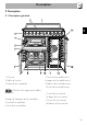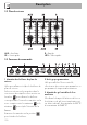 Description 2.2 Plan de cuisson AUX = Auxiliaire SR = Semi-rapide R = Rapide UR2 = Ultra-rapide 2.3 Panneau de commande 1 Manettes des brûleurs du plan de cuisson Utiles pour allumer et régler les brûleurs du plan de cuisson. Enfoncez et tournez les manettes dans le sens inverse des aiguilles d’une montre sur la valeur pour allumer les brûleurs correspondants. Tournez les manettes sur la zone comprise entre le maximum et le minimum flamme.