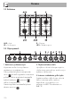 Kuvaus 2.2 Keittotaso AUX = Lisä SR = Puolinopea R = Nopea UR2 = Erittäin nopea 2.3 Ohjauspaneeli 1 Keittotason polttimien nupit 2 Ohjelmointilaitteen kello Käytetään tasolla olevien polttimien sytyttämiseen ja säätämiseen. Paina ja käännä kytkimiä vastapäivään arvon kohdalle sytyttääksesi vastaavat polttimet. Liekkiä säädetään kääntämällä kytkimiä maksimin ja minimin välillä olevalla alueella. Sammuta polttimet asettamalla kytkimet takaisin asentoon .