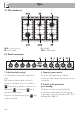 Opis 2.2 Płyta kuchenna AUX = Pomocniczy SR = Pół-szybki R = Szybki UR2 = Ultraszybki 2.3 Panel sterowania 1 Pokrętła palników płyty 2 Zegar programowania Do włączania i regulowania palników płyty. Aby włączyć dane palniki wcisnąć i przekręcić pokrętło w lewo na wartość . Przekręcać pokrętło w zakresie od Do wyświetlenia bieżącej godziny, ustawienia zaprogramowanego pieczenia i minutnika. maksimum do minimum wyregulować płomień. Włącza oświetlenie w piekarniku lub uruchamia grzałkę grilla.