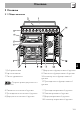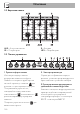 Описание 2.2 Варочная панель AUX = Вспомогательная SR = Полубыстрая R = Быстрая UR2 = Сверхбыстрая 2.3 Панель управления 1 Ручки конфорок панели 2. Часы программатора Используются для розжига и регулировки пламени конфорок. Нажмите и поверните ручки против часовой стрелки до символа для розжига соответствующих конфорок. Поворачивайте ручки в зоне, находящейся между символами максимального и минимального режима нагрева для регулировки пламени.