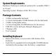 System Requirements Hardware: Desktop or notebook system with 1 available USB 1.1 or 2.0 port Operating System: Windows 2000, XP or Vista Package Contents • • • • • • • 2.4GHz rechargeable keyboard 2 x AAA rechargeable Ni-MH batteries (for the keyboard) 2.4GHz rechargeable mouse 2 x AA rechargeable Ni-MH batteries (for the mouse) USB RF receiver with pass through charging port Charging cable User’s manual Installing Keyboard • • Remove the battery cover located at the bottom of the keyboard.