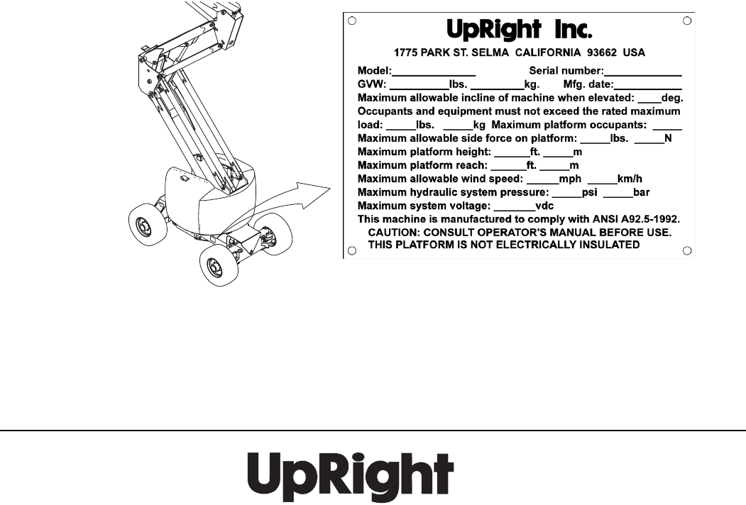 When contacting UpRight for service or parts information, be sure to include the MODEL and SERIAL NUMBERS