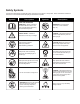 Safety Symbols The following table depicts and describes safety symbols that may appear on this product. Read, understand and follow all instructions on the machine before attempting to assemble and operate. Symbols Descriptions Symbols Descriptions READ THE OPERATOR'S MANUAL(S) – Read, understand and follow all instructions in the user manual(s) before attempting to assemble and operate. WARNING! Do not expose the unit to rain or wet conditions. Keep dry.
