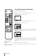 Presetting Channels Manually 1 Press MENU to display the main menu. 2 Move the cursor (z) to “PROGRAMME PRESET” with + ◊ or – √ and ON TIMER MENU SLEEP OK VIDEO Plus+ 1 2 3 4 5 6 7 8 9 ÷ 0 press OK. The PROGRAMME PRESET menu appears. PROGRAMME PRESET AUTO PROGRAMME MANUAL PROGRAMME SET UP GUIDE CH ONCE Se l ec t a n d p r e s s OK DAILY WEEKLY PROGR 3 Move the cursor (z) to “MANUAL PROGRAMME” with + ◊ or – √ and press OK. The MANUAL PROGRAMME menu appears.