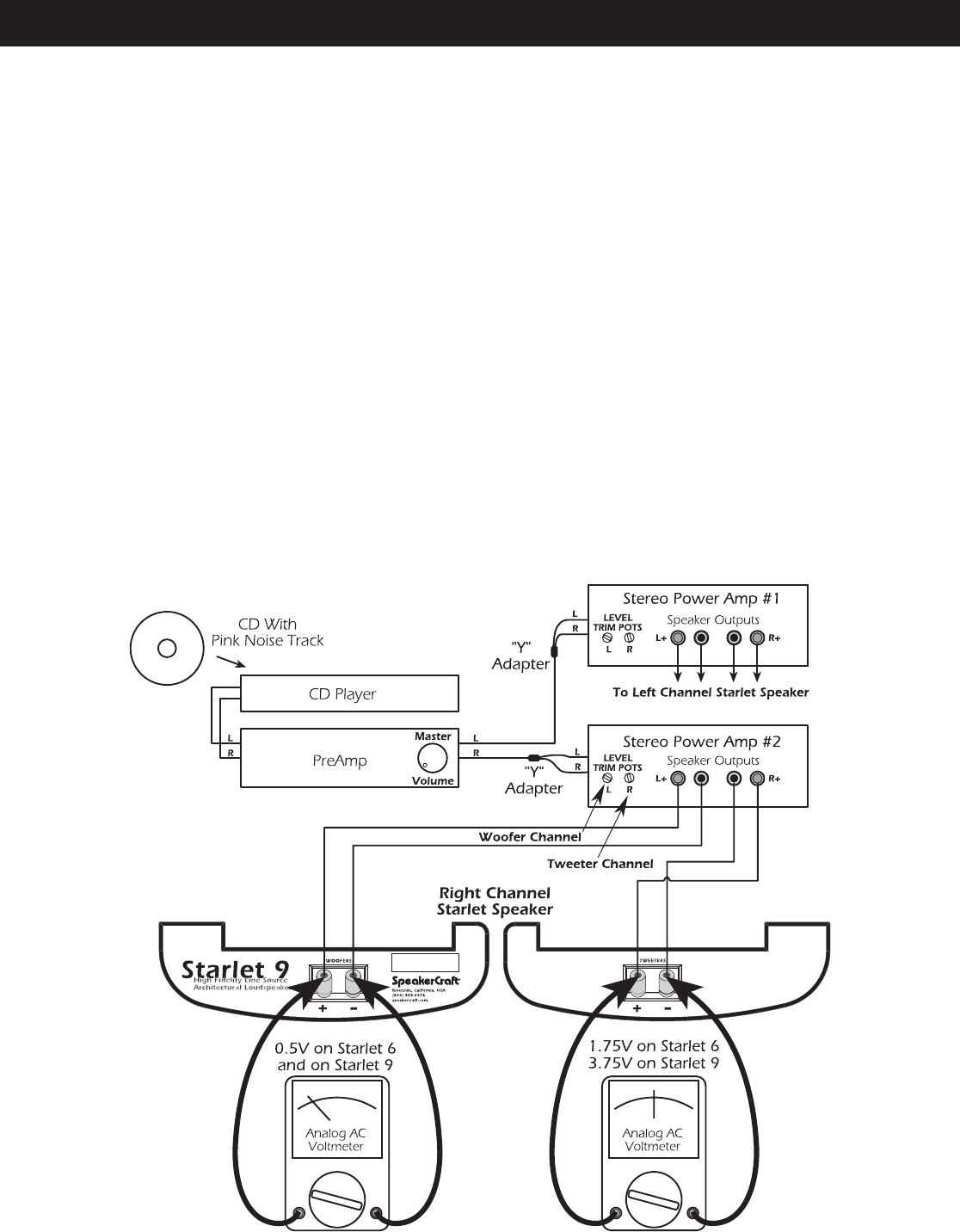 volume to get a reading of 1.75 volts on the Starlet 6 or 3.75 volts on the Starlet 9. Move the meter leads to the woofer channel