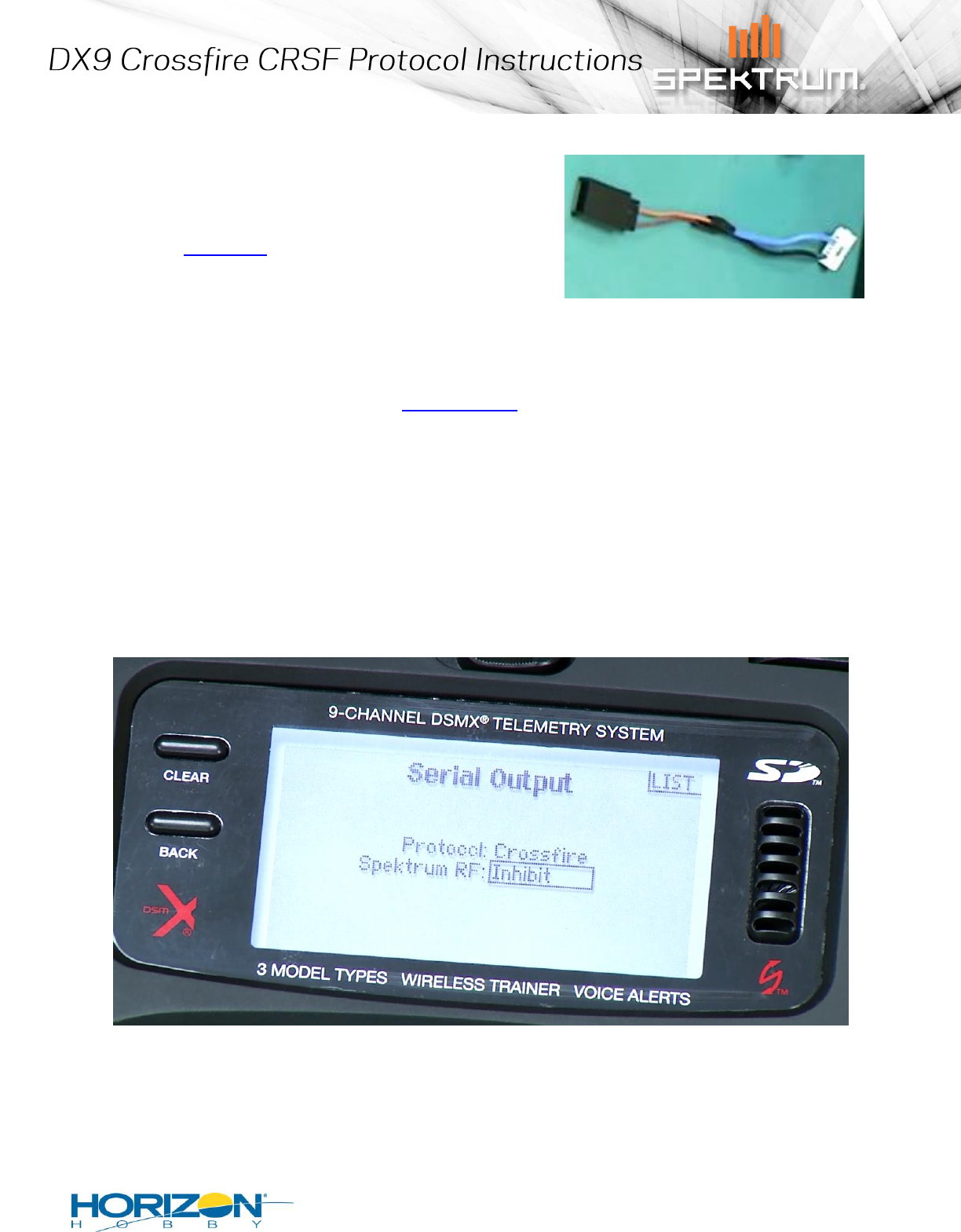(Protocol = Crossfire , Spektrum RF = Inhibit)