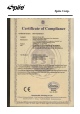 Spire Corp. 7 Mechanical Requirement 7.1 Dimension: 156mm*64mm*38mm 7.2 Weight: 293g±5g 7.3 Output Cord: 1.2M EU AC Cable 7.4 Plug: 1.3.5*1.3mm Yellow 2.4.0* 1.7mm Yellow 3.4.8* 1.7mm Yellow 4.5.5 *1.7mm Yellow 5.5.5*2.1mm Blue 6.5.5*2.5mm White 7.6.3*3mm Green 8.6*4.4mm Black 8 Correlative Certification compliance Item # Certification type 1 CE-EMC 2 CE-LVD Version:A/0 Certification Number BST10120427EC -1 BST10120427SC -2 Certification listing Remark WWW.BST-LAB.COM WWW.