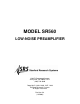 TABLE OF CONTENTS Introduction and Setup Instrument Overview Preparation for Use Line Voltage Line Fuse Line Cord Ventilation Power-Up Repackaging for Shipment Use in Biomedical Applications Warning Regarding Use with Photomultipliers Accessories Furnished Environmental Conditions Symbols 1 2 2 2 2 2 2 3 3 3 3 3 4 Specifications SR560 Low Noise Preamplifier Specifications Chart 5 Operation and Controls Front Panel Operating Summary Power Source Filters Gain Mode Gain Output Reset Status Rear Panel Opera
