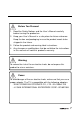 3 Description of Warning Symbols Warning Caution This symbol is used to remind users to pay attention to important descriptions regarding usage and maintenance (repair) or additional important information related to this product. This symbol is used to remind users to pay attention to the danger of electric shocks due to dangerous internal noninsulated components. Electric Power Notice Electric power may cause personal injury and mechanical damage if it is misused.