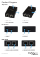 Product Diagram Top View 1 1 2 2 1. LED Indicator 1. LED Indicator 2. EDID Copy Button 2. EQ Selector Front View 1 2 1 1. Power Jack 1. Power Jack 2. HDMI In 2. HDMI Out 2 Rear View 2 1 1. LINK OUT A (RJ-45 Connector) 2 1 1. LINK IN A (RJ-45 Connector) 2. LINK OUT B (RJ-45 Connector) 2.
