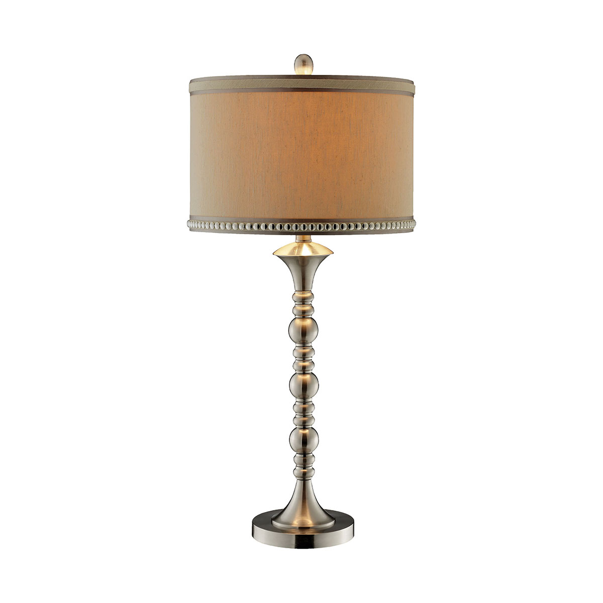 Brushed nickel finish metal candlestick style table lamp. Drum