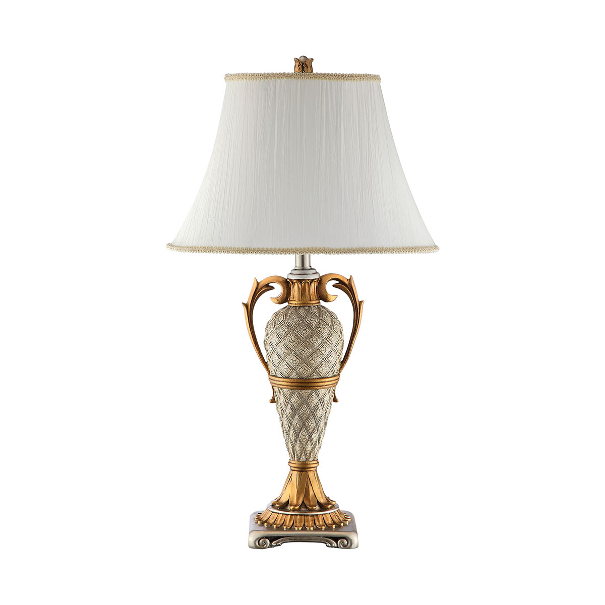 resin table lamp. Cream-colored softback bell shade with