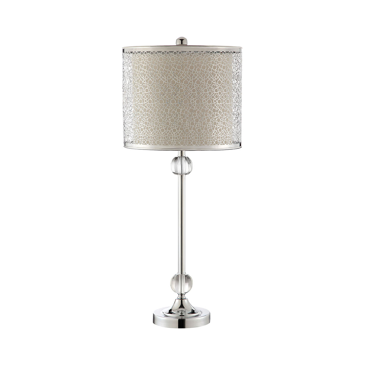Chrome finish metal table lamp with two crystal sphere fonts.