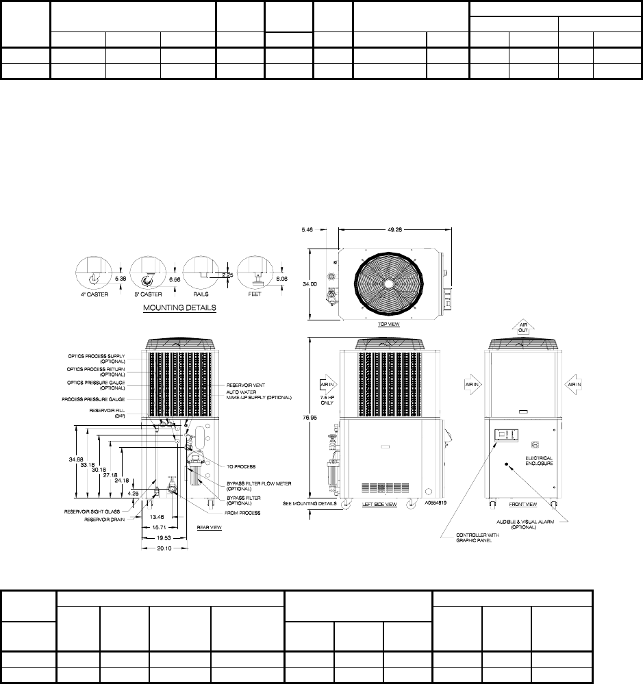 5 hp and 7.5 hp air-cooled chillers come standard with 4” (101 mm) swivel casters.