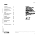 English KombiSystem Guide to Using this Manual Safety Precautions and Working Techniques Approved KombiTools Mounting the Loop Handle Carrying ring Fuel Fueling Starting / Stopping the Engine Operating Instructions Cleaning the Air Filter Adjusting the Carburetor Spark Plug Engine Running Behavior Storing the Machine Inspections and Maintenance by Dealer Maintenance and Care Main Parts Specifications Maintenance and Repairs Disposal EC Declaration of Conformity © ANDREAS STIHL AG & Co.