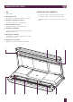 RU ЧТО НУЖНО ЗНАТЬ О ПРИБОРЕ 5. Крюки Фиксируют крышку. 6. Запаивающая панель Запаивает пакеты и рулоны при помощи нагрева. 7. Верхняя и нижняя прокладки Образуют вакуумную камеру. 8. Приток воздуха Для использования с контейнерами. 9. Вакуумная камера Удаляет воздух из пакета и собирает лишнюю жидкость из пакета. 10. Запаивающий элемент Нагревательный элемент с тефлоновым покрытием, запаивающий пакеты и рулоны. 11. Кнопки разблокировки Сбрасывают давление вакуума внутри устройства.