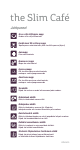 the Slim Café Kirjeldus Eriti kompaktne disain Mõõtmed: 18 cm (laius) x 31,5 cm (kõrgus) x 39,5 cm (sügavus) Kõrgsurvepump Täiuslikuks tõmbamiseks Kuumutussüsteem Thermoblock Patenteeritud eeltõmbamis- ja tõmbamistehnoloogia Veeanum Hõlpsalt eemaldatav Kohviubade anum Tihedalt suletava kaanega anumas säilib kohviubade aroom Puutetundlik juhtpaneel Kasutamise lihtsustamiseks Roostevabast terasest jahvatusseade Viie jahvatusastmega 45° reguleeritav auruotsak Piima vahustamise ja vee jaotamise hõl