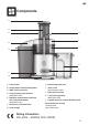 EN Components A B C H I D J E K L F G A. Food pusher B. Unique Direct Central Feed System C. Wide 75mm feed chute D. Large capacity pulp container (dishwasher safe). E. Stainless steel titanium reinforced micro mesh filter basket (dishwasher safe). F. Heavy duty 1200 watt motor G. Cord storage H. Interlocking safety arm I. Juicer cover (not dishwasher safe). J. Filter bowl surround K. 1 litre juice jug and lid (dishwasher safe). L.