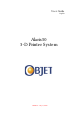 About This Guide Using This Guide This user guide provides instructions for installing, operating and maintaining Alaris 3‐D printing systems. It explains how to use features, and provides practical examples to guide you as you use the system. This document is meant to be used with the Alaris30 3‐D printer, running software version 30.2.1, and with Objet Studio software version 8.5.9.