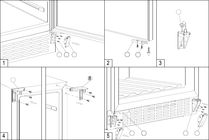 7. Relocate the glass door to the designated position.Then screw the bottom hinge on the left designated