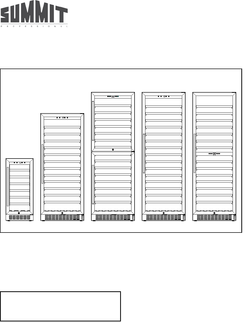 WINE CELLARS Model Nos.: SWC1535B/SWC1102/SWC1875B/SWC1926/SWC1966 Instruction Manual BEFORE USE, PLEASE READ AND FOLLOW ALL SAFETY RULES AND OPERATING INSTRUCTIONS. Write Serial No. (on lower left corner of inside cabinet) here: ___________________________________________ Felix Storch, Inc. 770 Garrison Avenue Bronx, NY10474 www.summitappliance.