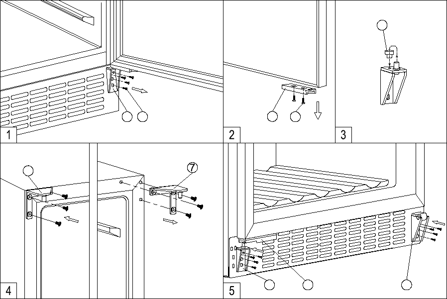 1. Remove the bottom hinge 1 by unscrewing the four lock screws 2. Be careful to hold the glass door