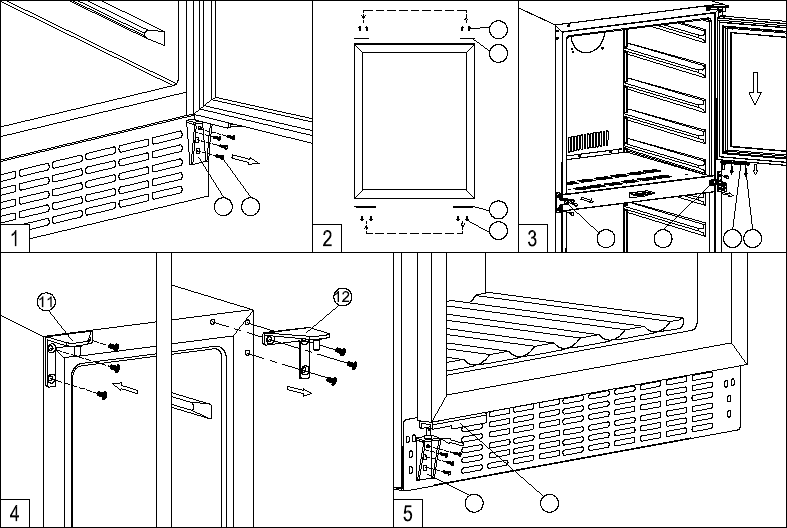 2. Unscrew and transfer the lower door adapters 4 & 5 to the left designated positions of glass door. (Fig.