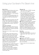 Using your Sunbeam Pro Steam Iron (continued) Using the shot of steam The shot of steam can be used whether dry or steam ironing when the temperature dial is set to any temperature above the two dot (••) setting. 1. Ensure the tank is at least ¼ full of water. 2. Select the desired temperature and wait until the thermostat light goes out. 3. Press the shot of steam button several times with the iron on the soleplate to prime the pump.
